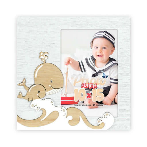 Visualizza tutti i dettagliCornice Willy in legno, colore bianco e marrone, con decori a rilievo a forma di balene, da tavolo, ideale per celebrare la nascita, adatta ad un b...