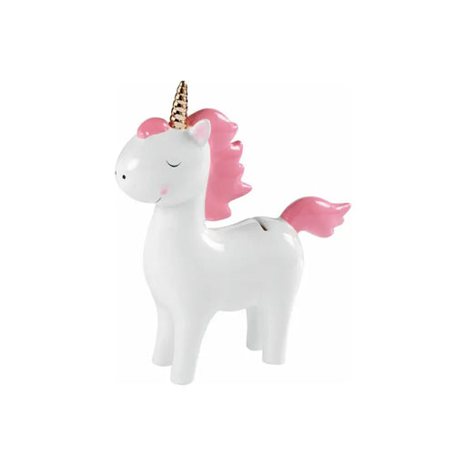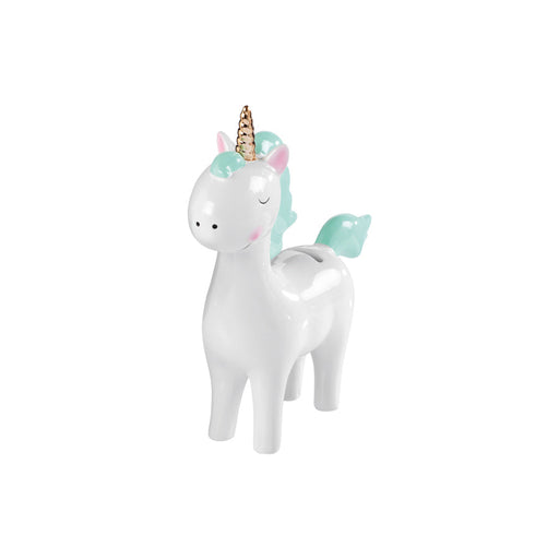 Salvadanaio in ceramica colorata, con corno dorato. Dimensione: 21x7x24,5 cm. Colorazioni disponibili: celeste o rosa.