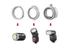 L’ML-CD15 viene fornito con una gamma di diversi adattatori di montaggio, che ne consentono l’uso con uno Speedlite tradizionale, uno Speedlite a testa tonda o con luci flash e LED con raccordo GODOX.